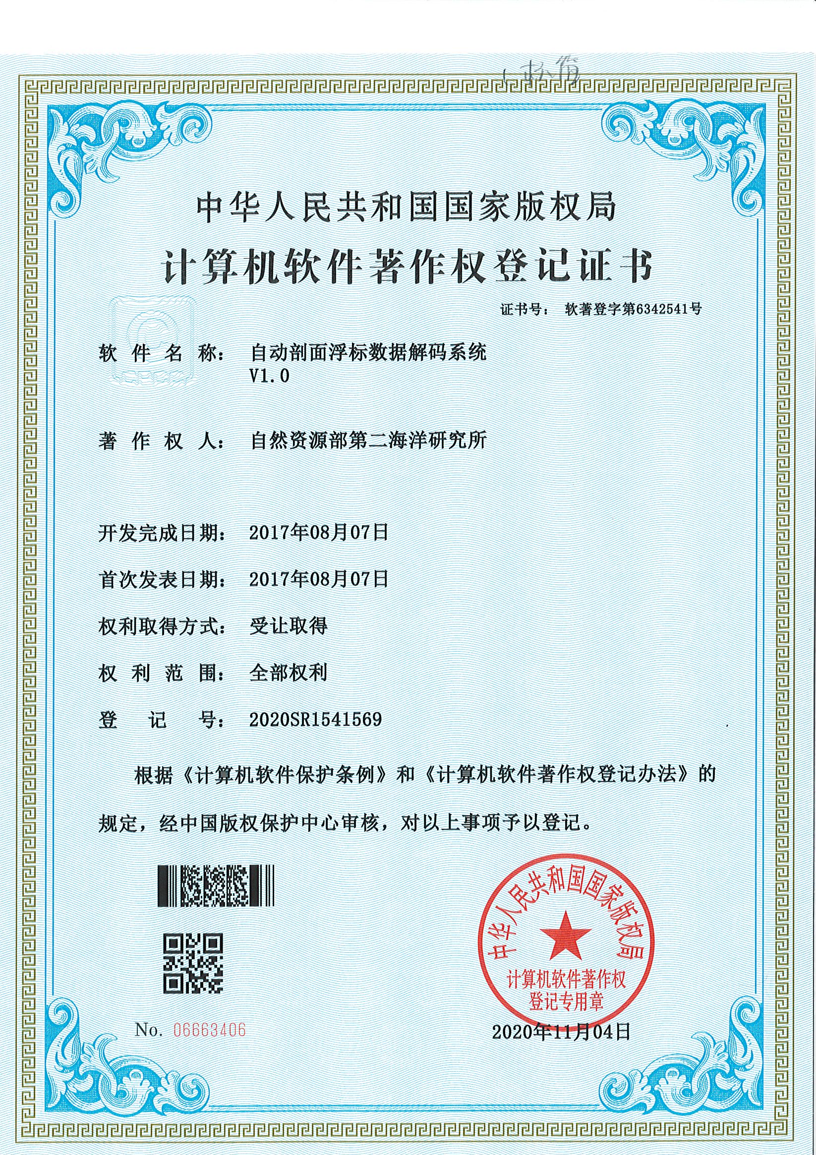 由刘增宏高级工程师设计编写的自动剖面浮标数据解码系统申请了计算机软件著作权登记证书。
